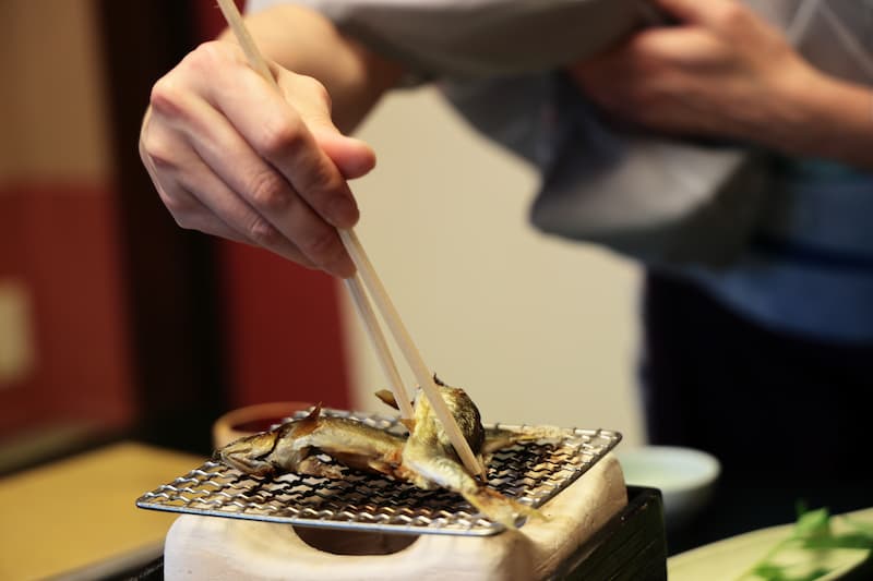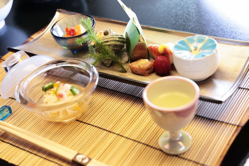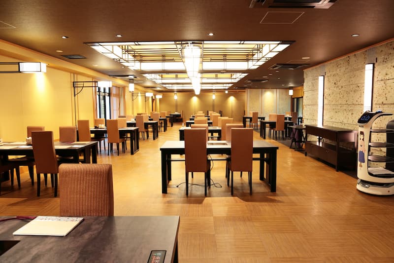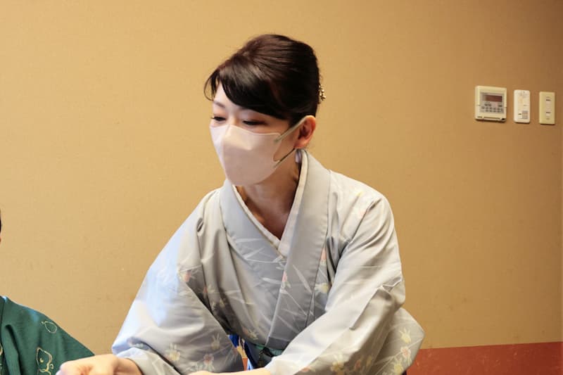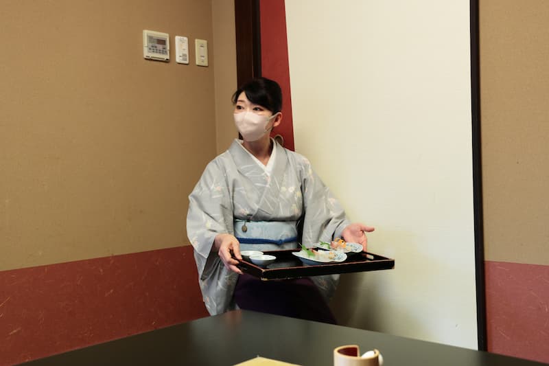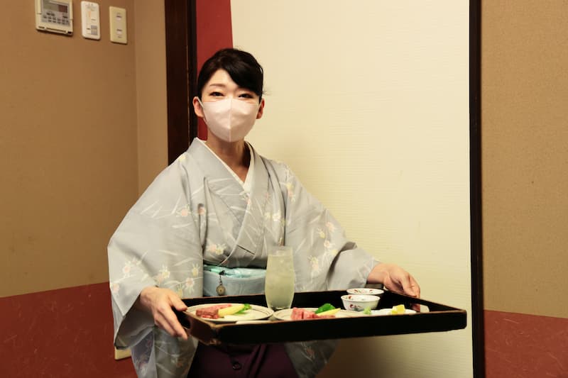 พนักงานที่ดูแลมื้ออาหารแต่งกายด้วยชุดแบบญี่ปุ่น