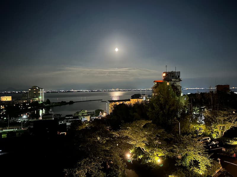 ด้านนอกห้อง มีวิวกลางคืนที่สวยๆ ของทะเลสาบบิวาโกะ